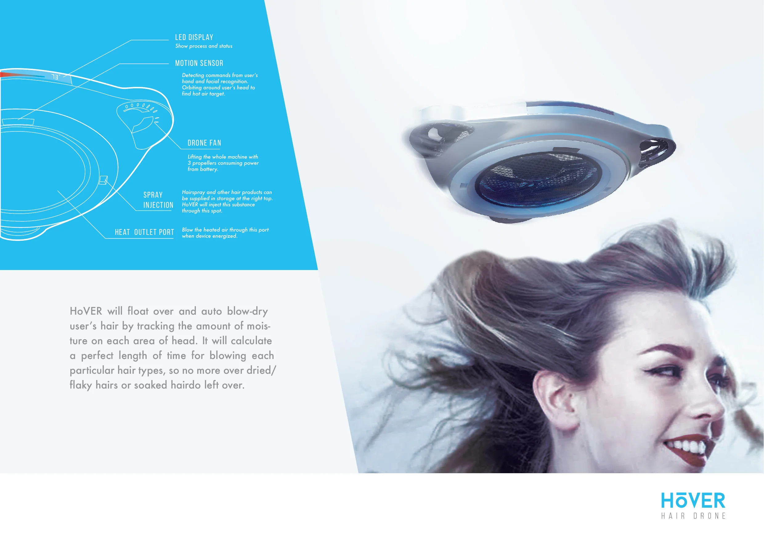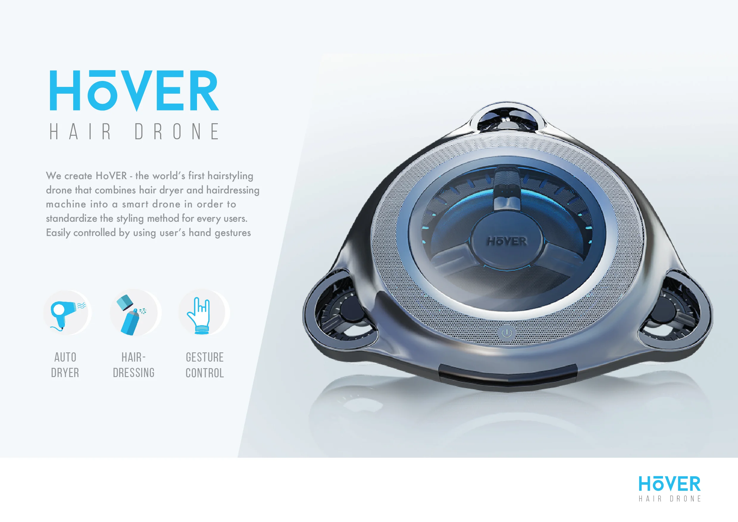 Traditionally, styling hair requires a human hand skill and some experience in order to achieve individual desired hairstyle. And most of the time we failed, and still got a bad hair day due to a myth of many hairdressing factors - such as low quality of hair blowing, inconsistent application of hairstyling paste, have no time or not competent to do by him/herself. We create Hover - the world’s first hairstyling drone in order to standardize the hairstyling method for every users. Hover will float over and auto blow-dry user’s hair by tracked the amount of moisture on each area of head. It will calculate a perfect time for blowing each particular hair types, no more over dried hairline or soaked at the back.
